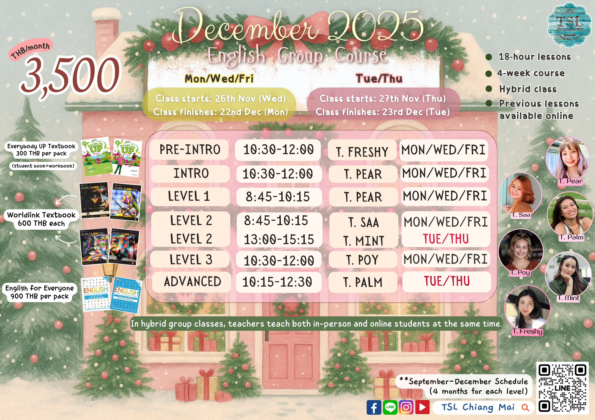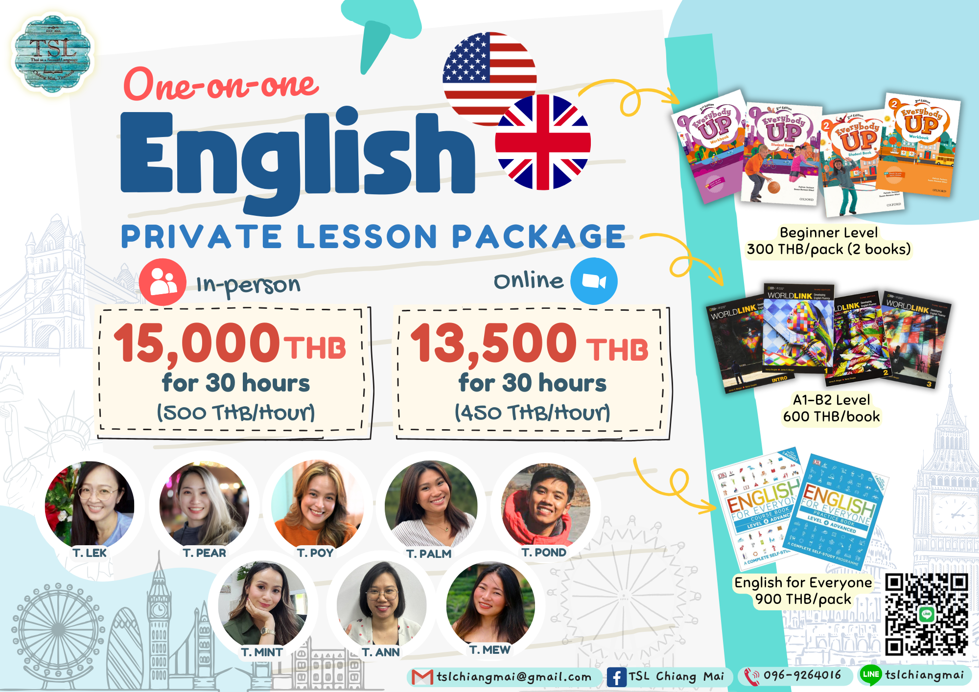 TSL Chiangmai offers adult-focused English courses using National Geographic Learning (NGL) and Oxford approaches. Build real-life communication skills and speak with confidence—for travel, study, and work.
